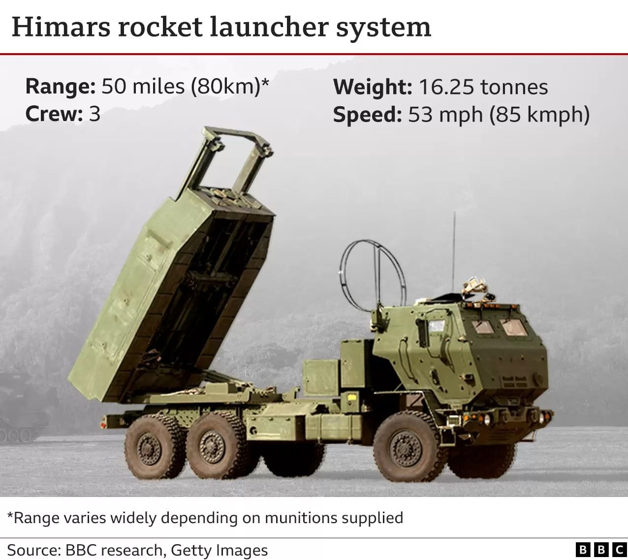 سامانه HIMARS که بردی بیش از ۸۰ کیلومتر دارد، یکی از موثرترین ابزارها در زرادخانه نظامی کییف است. وزن پایین هیمارس از مزیتهای آن است زیرا میتوان با هواپیماهای ترابری به راحتی آن را به نقاط مختلف منتقل کرد.آمریکا این توپخانه موشکی را با راکتهای M۳۱ GMLRS به این کشور فرستاده است. هرچند که گفته میشود بسته به نوع راکت یا موشک، این توپخانه از ۹ تا ۵۰۰ کیلومتر برد دارد.