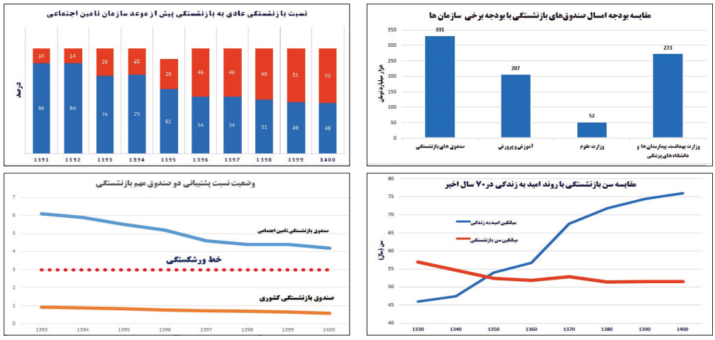 شاخص «نسبت پشتیبانی» در صندوقهای بازنشستگی نشان میدهد که 15 صندوق به سطح ورشکستگی رسیدهاند و فقط دو صندوق بازنشستگی در وضعیت بهتری هستند. هرچند که روند ناامیدکنندهای را طی میکنند و تا خط ورشکستگی فاصلهای ندارند. وضعیت ۱۷ صندوق بازنشستگی فعال در کشور نشان میدهد این شاخص در دو صندوق وکلا و روستایی- عشایری که نسبتا جوان هستند، وضعیت بسیار مناسبی دارد؛ در تامین اجتماعی روند بهتری دارد (اما مطلوب نیست) و در سایر صندوقها وضعیت بحرانی است و عملا بدون کمک دولت و نهادهای مالک امکان ادامه حیات صندوق وجود ندارد و باید اعلام ورشکستگی کند. نسبت پشتیبانی به معنای «نسبت بیمهپردازان به مستمریبگیران» است. کمترین نسبت پشتیبانی برای آنکه یک سازمان بیمهای به مرز ورشکستگی نرسد، عدد ۳ است. حالا این نسبت در صندوقهای بازنشستگی کشور تا حدی کاهش یافته که میتوان وضعیت کنونی اغلب صندوقها را «ورشکسته» نامید. با ادامه پیری جمعیت و روند کاهشی نسبت پشتیبانی، در کنار افزایش میزان بازنشستگیهای پیش از موعد، فشار بر صندوقهای بازنشستگی نیز بیشتر میشود.