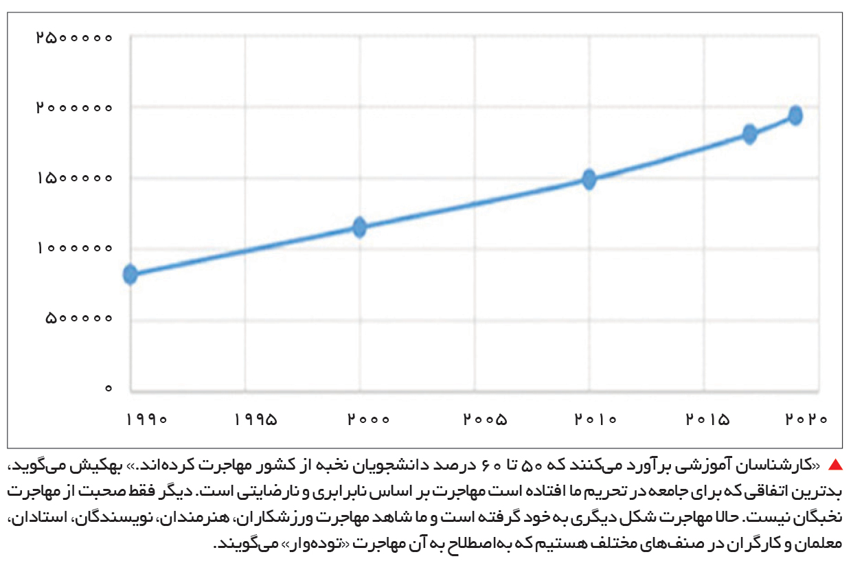 «کارشناسان آموزشی برآورد میکنند که 50 تا 60 درصد دانشجویان نخبه از کشور مهاجرت کرده باشند.» بهکیش میگوید، بدترین اتفاقی که برای جامعه در تحریم ما افتاده است مهاجرت بر اساس نابرابری و نارضایتی است. دیگر فقط صحبت از مهاجرت نخبگان نیست. حالا مهاجرت شکل دیگری به خود گرفته است و ما شاهد مهاجرت ورزشکاران، هنرمندان، نویسندگان، استادان، معلمان و کارگران در صنفهای مختلف هستیم که بهاصطلاح به آن مهاجرت «تودهوار» میگویند. در این سالها آنهایی که پول، سواد و تجربه داشتند، به بهانه کار و تحصیل کشور را ترک کردند و آنهایی که نه پول آنچنان داشتند و نه تحصیلات بالا راههای پرخطر دیگری را انتخاب کردند تا از طریق آن بلکه بتوانند پناهندگی بگیرند؛ مهاجرتی که به گفته آنهایی که رفتند بسیار هزینهبر و دردناک است. اما برای برخیها راهحلی برای ادامه زندگی شده است. بهرام صلواتی، رئیس رصدخانه مهاجرت ایران به موارد پناهندگی و پناهجویی ایران اشاره میکند و میگوید: «معمولاً سازمان ملل گزارشهایی درباره افراد گمشده منتشر میکند اما عدد واقعی چندبرابر این آمار است. سالانه ۲۰ تا ۳۰ هزار نفر گم میشوند و از سرنوشت آنها خبری نیست. چون افراد از مسیرهای غیرقانونی میروند، مدارک شناسایی خود را از بین میبرند. تراژیکتر از مسیر و کانالهای مهاجرتی، مهاجرت اجباری پناهجویی است.»