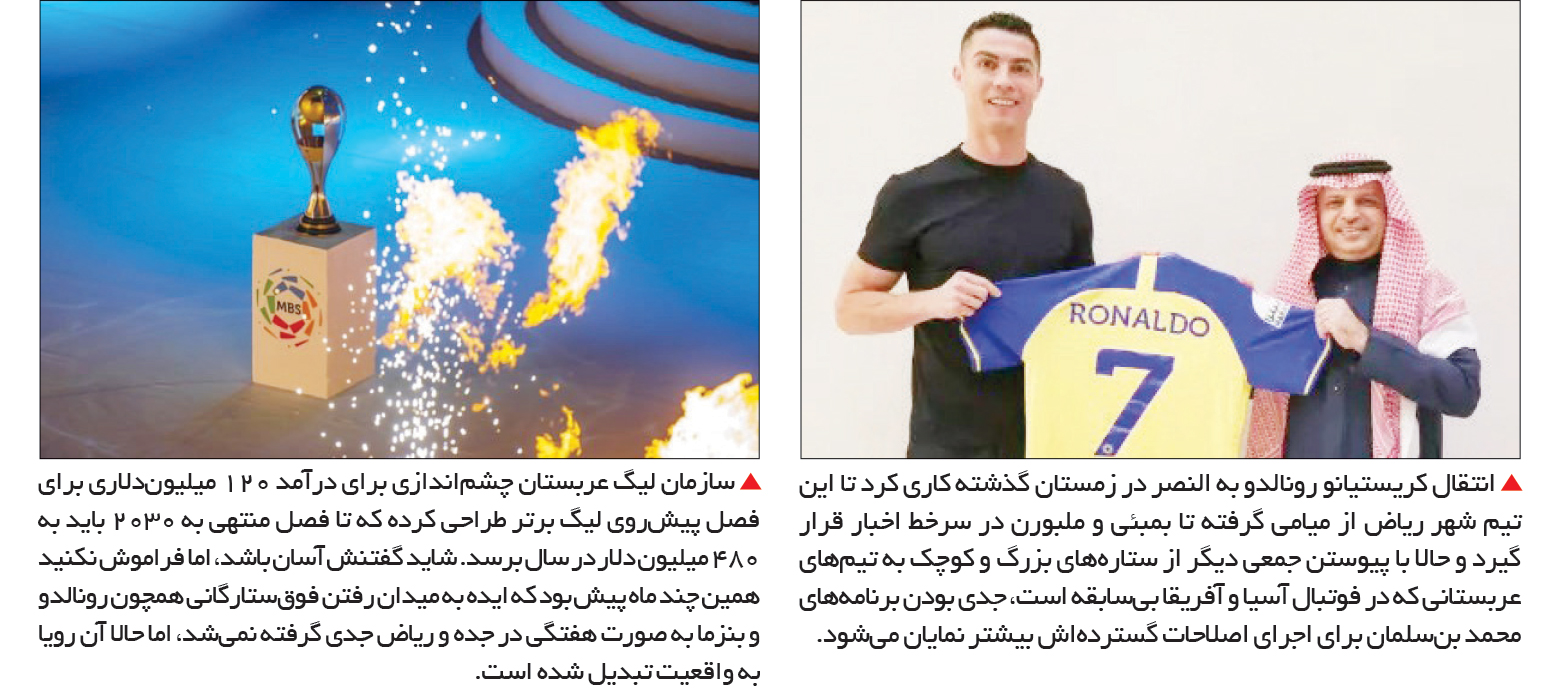 تیم ملی عربستان با حضور در جامهای جهانی و کسب عناوین ملی و باشگاهی آسیایی همیشه یک قدرت برتر فوتبال در منطقه به حساب میآمده. بازی درخشان آنها برابر آرژانتین قهرمان در جام جهانی قطر و البته آمار باشگاههایی مانند الهلال در لیگ قهرمانان آسیا نشان از بزرگی و البته پتانسیل بالای فوتبال این کشور برای یک تغییر اساسی و تبدیل شدن به یک نیروی جهانی دارد که در صورت موفقیت، هم چشمانداز فوتبال محلی در غرب آسیا و شمال آفریقا را دگرگون میکند و هم کفه ترازو را به نفع این کشور که سنتگرایی و تکمحصولی بودن از مهمترین ویژگیهایش بوده تغییر میدهد. این راهی برای تنوع بخشیدن به اقتصاد عربستان به دور از نفت و همچنین بهکارگیری «ابزار قدرت نرم» است که از طریق آن میتوان اعتبار بینالمللی ایجاد کرد. انتقال کریستیانو رونالدو به النصر در زمستان گذشته کاری کرد تا این تیم شهر ریاض از میامی گرفته تا بمبئی و ملبورن در سرخط اخبار قرار گیرد و حالا با پیوستن جمعی دیگر از ستارههای بزرگ و کوچک به تیمهای عربستانی که در فوتبال آسیا و آفریقا بیسابقه است، جدی بودن برنامههای محمد بنسلمان برای اجرای اصلاحات گستردهاش بیشتر نمایان میشود. امروز پیراهنهای النصر و الاتحاد با نامهای رونالدو و بنزما در سراسر جهان دیده میشوند و با توجه به اینکه حق پخش لیگ برتر عربستان به 36 منطقه خارج از کشور فروخته شده، بازیهای ستارههای محبوب در سراسر دنیا پخش خواهد شد و این چیزی است که هیچ یک از همسایگان عربستان سعودی یارای رقابت با آن را ندارند.