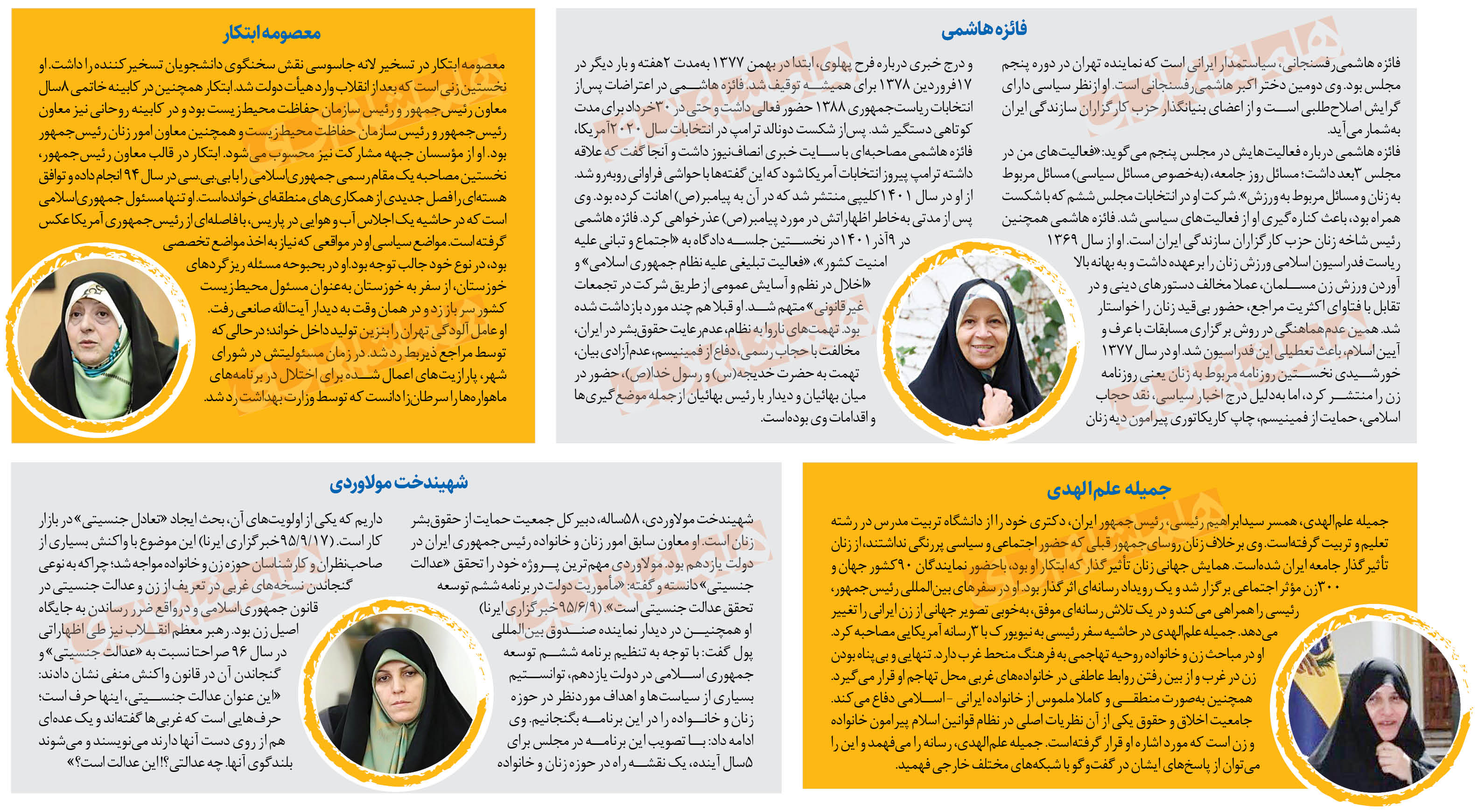 مسئله زن در جمهوریاسلامی، یکی از آن موضوعهای اساسیای است که هویت انقلاب اسلامی را به بهترین و روشنترین وجه مینمایاند. یک وجه از تلاشهای دشمن برای تخریب جمهوری اسلامی نیز شکل دادن به تصاویر انحرافی یا ناقص از زن ایرانی مسلمان است.به بهانه حضورهای رسانهای و مؤثر جمیله علمالهدی، همسر سیدابراهیم رئیسی در رسانههای بینالمللی و ایجاد یک تصویر جدید و مترقی از زن مسلمان، به برخی از بانوان اثرگذار در تاریخ سیاسی - اجتماعی ایران میپردازیم.