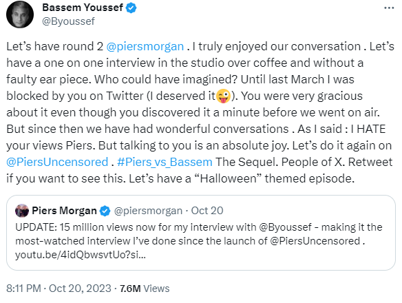باسم یوسف در توییت خود نوشته که بسیار از این گفت وگو لذت برده و ادامه داده هر چند که از دیدگاههای مورگان نفرت دارد اما گفت وگو با او برایش دلپذیر است و خواسته که بار دیگر با هم صحبت کنند.