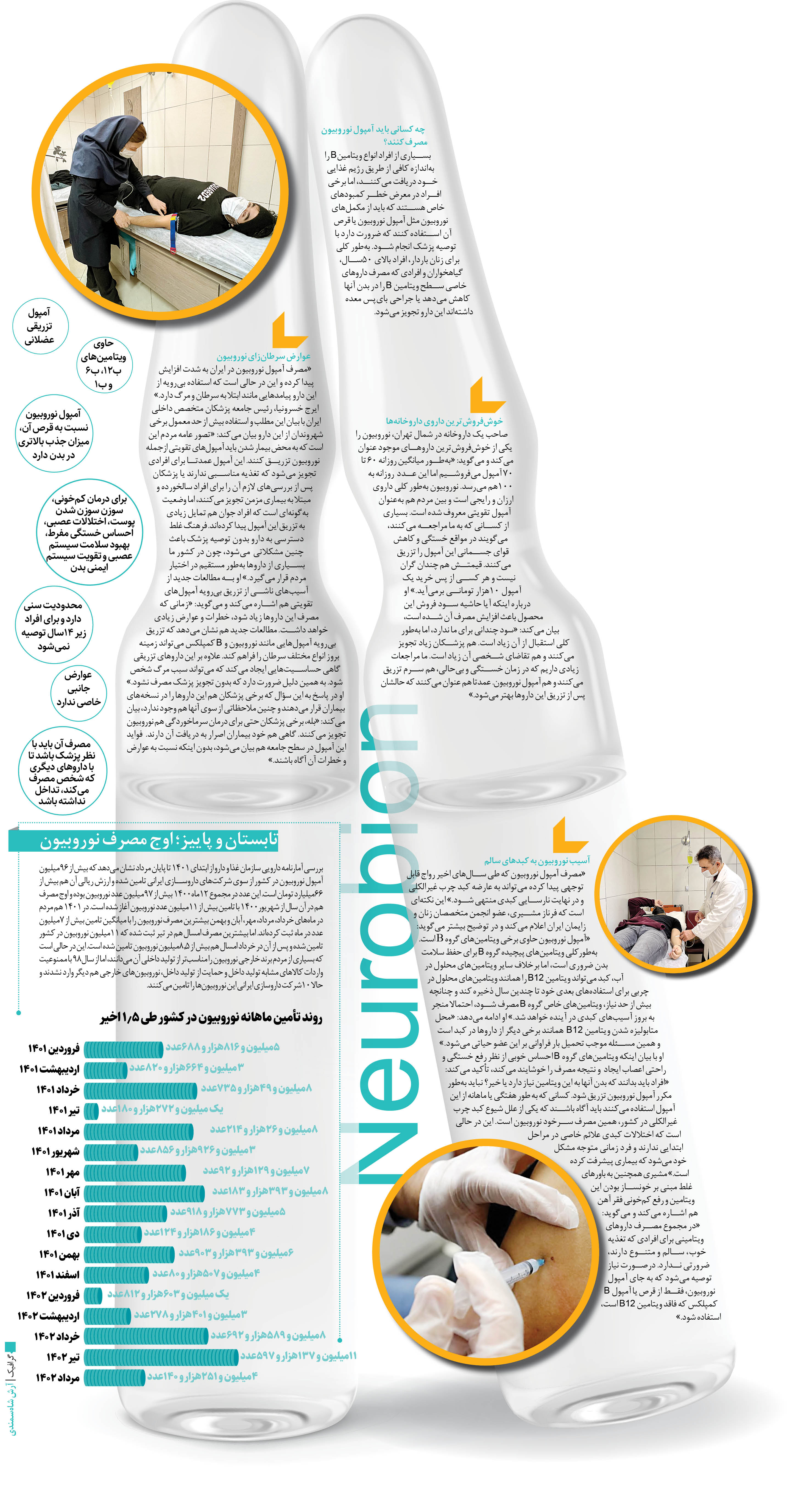 مریم سرخوش| طبق گزارش جامعه پزشکی آمار مصرف خودسرانه دارو در ایران بالاست، اما این رقم در داروهای تقویتی ازجمله آمپولهای نوروبیون قابلتوجهتر است. سرانه مصرف داروهای تزریقی در ایران حدود 11.4درصد و تقریبا 4برابر جوامع توسعهیافته است. آمپول نوروبیون از ویتامینهای ب12، ب6 و ب1 تشکیل شده و در بین مردم ایران بهعنوان آمپول تقویتی معروف است؛ دارویی بسیار رایج که عموم مردم تصور میکنند باید برای درمان بیماریهای مختلف، رهایی از خستگی و تقویت نیروی جسمانی تزریق کنند. عجیبتر آنکه توصیههای مردمی برای تزریق نوروبیون هم بهشدت رواج گرفته و بسیاری از مردم یکدیگر را به تزریق این آمپول در مواجهه با انواع بیماریها و خستگیهای روزانه توصیه میکنند. با این که نوروبیون از خانواده ویتامینهای گروه ب و در درمان بسیاری از اختلالات مؤثر است، اما اخطار جدی درباره آن مصرف بیرویه و بدون تجویز پزشکان است؛ چون میتواند عوارض مرگباری را برای فرد به همراه داشته باشد. جدیدترین مطالعات نشان میدهد که مصرف خودسرانه این داروی ارزان و در دسترس میتواند زمینه بروز انواع مختلف سرطان را فراهم کند. پزشکان هم میگویند یکی از دلایل مهم افزایش کبد چرب غیرالکلی در جامعه ایرانی استفاده مکرر از نوروبیونهاست؛ این در حالی است که مصرف بیش از حد نوروبیون، دوز فلزات سنگین موجود در بدن را هم بالا میبرد و میتواند به عوارضی ازجمله مسمومیت منجر شود.