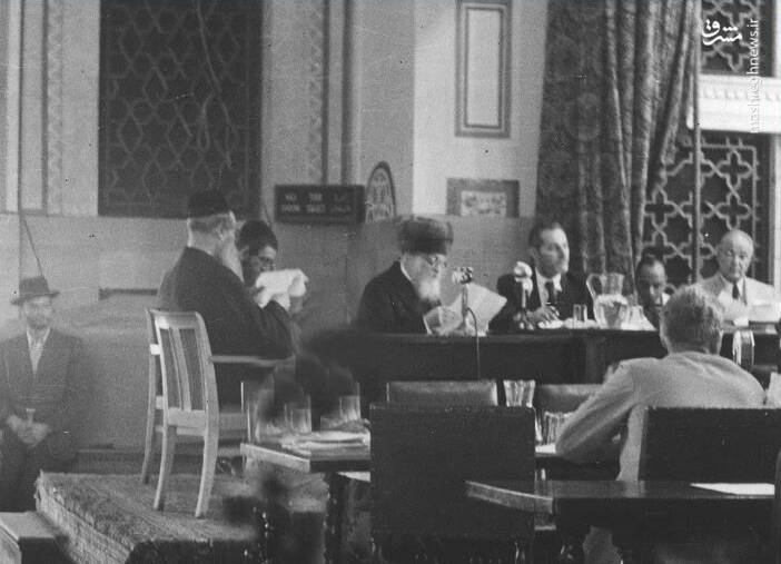 خاخام ارشد «یوسف تسوی دوشینسکی» (مرکز تصویر)، ۱۶ جولای ۱۹۴۷، در حال ارائهی شهادت در نشست کمیتهی ویژهی سازمان ملل در مورد فلسطین. شهادت ۱۸-صفحهای خاخام دوشینسکی همچنان در اسناد سازمان ملل موجود است. با این حال، سازمان ملل نهایتاً با فشار صهیونیستها و حامیان آنها در اروپا و آمریکا، رأی به تشکیل یک «کشور یهودی» در فلسطین داد.