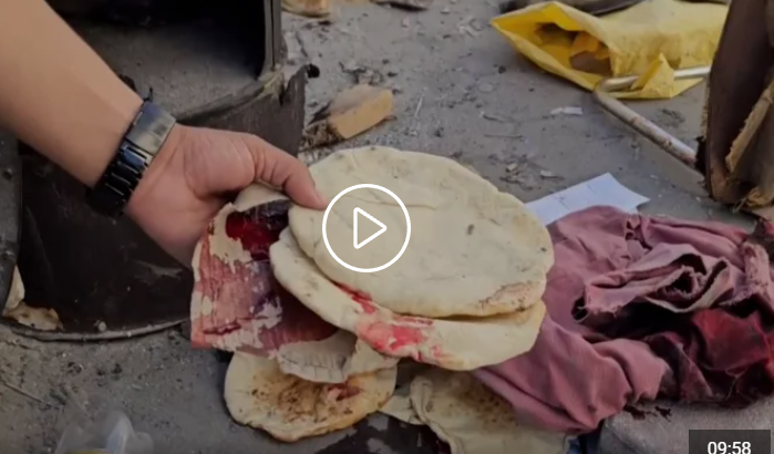 این هم تصویری از دوربین تلویزیون الجزیره است از نانی که زنان حاضر در مدرسه با تنورهای ابتدایی در حال پختن آن بودند و اکنون به خون شان آغشته شده است.