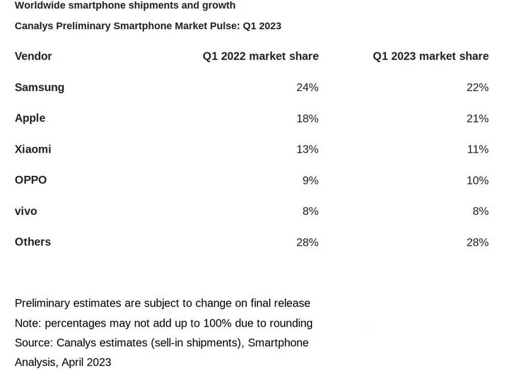 سامسونگ با سهم ۲۲ درصدی از بازار در جایگاه اول قرار دارد و اپل و شیائومی به ترتیب با ۲۱ و ۱۱ درصد در رتبههای بعدی قرار گرفتهاند. همچنین میزان تقاضا برای گوشیهای هوشمند در سهماهه اول سال ۲۰۲۳ نسبت به مدت مشابه در سال گذشته، کاهش ۱۲ درصدی را شاهد بوده است. حتی کاهش قیمت بعضی از محصولات و ارائه طرحهای فروش ویژه نیز نتوانسته است افت جهانی فروش موبایل را متوقف سازد و به نظر میرسد این روند همچنان ادامه داشته باشد.