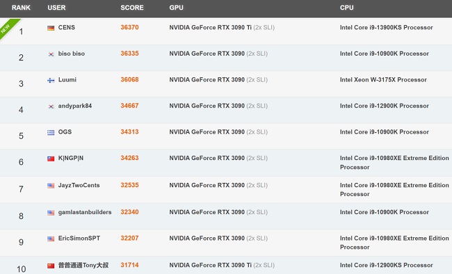 جدیدترین رکورد دنیای 3DMark مربوط به بنچمارک Port Royal است. اورکلاکر CENS توانسته با شکستن رکورد پیشین و ثبت امتیاز 36730 در بنچمارک RTX 3090 Ti، رکورد پیشین را بشکند. برای این کار از پردازنده Core i9-13900K اینتل و یک کیت حافظه DDR5 اورکلاک شده به 8400 مگاهرتز استفاده شده بود.