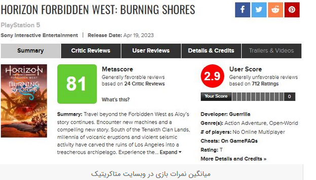 گفتنی است که بازی Horizon Forbidden West در حال حاضر برای پلی استیشن ۴ و پلی استیشن ۵ در دسترس است، اما بسته الحاقی Burning Shores فقط برای پلی استیشن ۵ منتشر شده است.