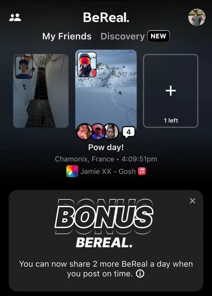 این شبکه اجتماعی در کنار اعلام تعداد کاربران روزانهاش، از یک ویژگی جدید هم رونمایی کرده است که میتواند به جذب بیشتر کاربران کمک کند. این قابلیت که Bonus BeReal نام دارد، هماکنون در بریتانیا در حال آزمایش است و به زودی به سایر نقاط جهان هم راه پیدا میکند. این ویژگی به کاربران اجازه میدهد هر روز در زمانهایی که خودشان مشخص میکنند، دو عکس دیگر هم بگیرند، البته تا زمانی که عکس عادیشان را هم در پنجره زمانی 2 دقیقهای مدنظر BeaReal منتشر کنند.