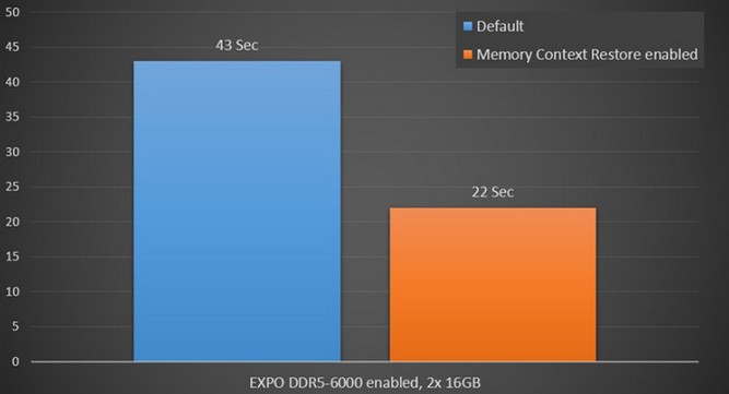 این نمودار سیستمی مجهز به دو ماژول 16 گیگابایتی DDR5-6000 از Kingston را نشان می دهد که با فعال کردن قابلیت Memory Context Restore، زمان بوت مادربرد از 43 به 22 ثانیه میرسد.