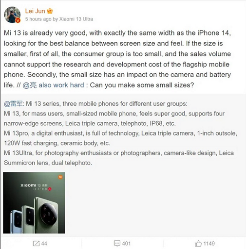 لی جون در پاسخ به یکی از کاربران Weibo که پرسیده است آیا شیائومی میتواند گوشیهای کوچک و جمعوجور بسازد، گفت که Xiaomi 13 درحالحاضر گزینه بسیار خوبی است، دقیقاً با همان عرض آیفون 14 که تعادلی بین اندازه نمایشگر و حس راحتی درهنگام در دست قرارگرفتن را منتقل میکند. درمجموع، مدیرعامل شیائومی اشتباه نمیکند زیرا در بسیاری از منتقدان در بررسیهای خود پیرامون Xiaomi 13 به این نکته اشاره کردهاند که این گوشی هوشمند حس در دست گرفتن واقعاً خوبی دارد.