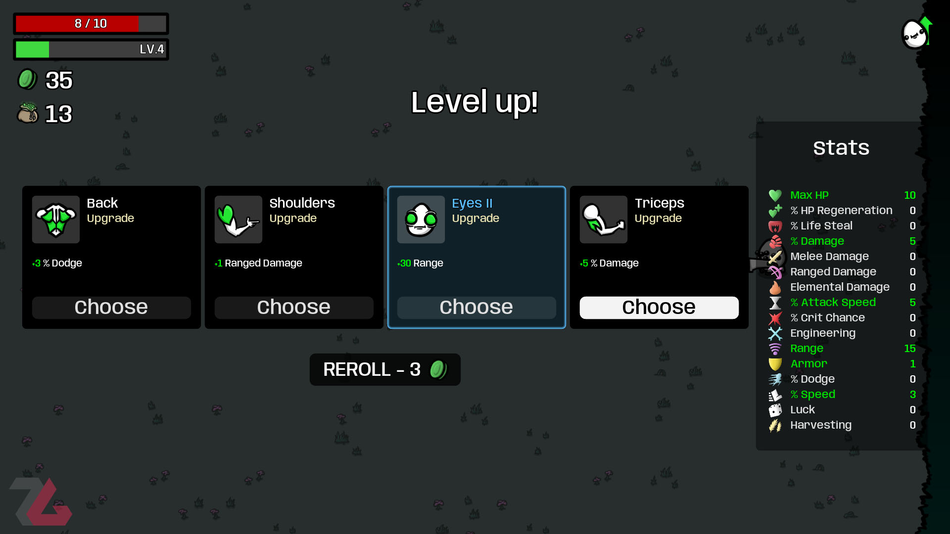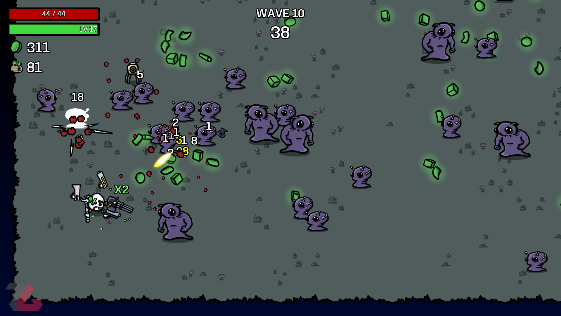 در پایان هر موج از دشمنان، با توجه به منابعی که با کشتن آنها جمع کردهاید، میتوانید ابتدا مهارت شخصیت خودتان را ارتقا بدهید؛ ارتقاها شامل مواردی مثل سرعت، سطح کلی سلامت و میزان بازیابی خودکار آن، سرعت شلیک، شانس بهدست آوردن منابع بیشتری و مواردی از این دست میشوند. پس از ارتقا هم میتوانید با خرج مستقیم منابع، سلاح یا آیتم جدید برای شخصیت خودتان بخرید. شخصیت بازی قابلیت حمل نهایت ۶ سلاح همزمان را دارد و وقتی این ۶ سلاح را داشته باشید، ظاهر بامزهای که کاراکتر در بین آنها پیدا میکند، حسابی خندهدار میشود.