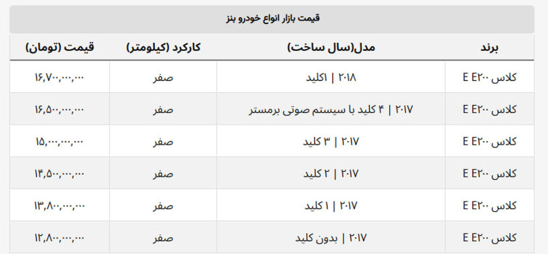 قیمت بنز E۲۰۰ مدل ۲۰۱۸ یک کلید ۳۰۰ میلیون تومان کاهش یافت و ۱۶ میلیاردو ۷۰۰ میلیون تومان شد مدل ۲۰۱۷ این خودرو نیز ۲۰۰ میلیون تومان کاهش قیمت داشت. E۲۰۰ مدل ۲۰۱۷ بدون کلید نیز با ریزش ۲۰۰ میلیونی به ۱۲ میلیارد و ۸۰۰ میلیون تومان رسید.