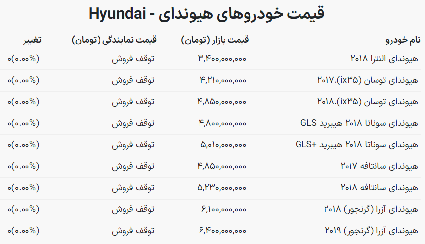 بر اساس قیمت خودروهای وارداتی، قیمت هیوندای النترا ۲۰۱۸ به ۳ میلیارد و ۴۰۰ میلیون تومان رسیده است. قیمت هیوندای سانتافه ۲۰۱۷ نیز ۴ میلیارد و ۸۵۰ میلیون تومان است. همچنین قیمت هیوندای آزرا سال ۲۰۱۸ نیز ۶ میلیارد و ۱۰۰ میلیون تومان است.