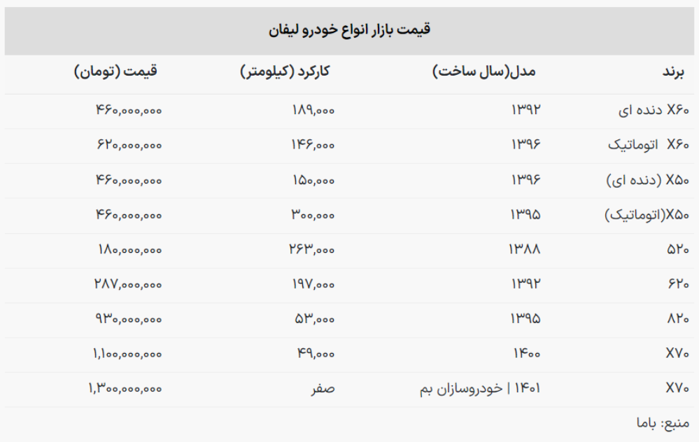 با مطالعه جدول زیر اطلاعات بیشتری درباره قیمت روز خودروهای لیفان به دست خواهید آورد: