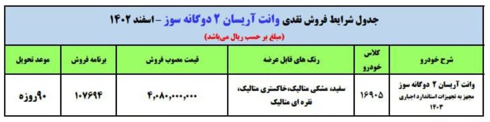 ایران جیب/ فروش فوق العاده محصول وانت آریسان 2 دوگانه سوز (ویژه متقاضیان عادی) از 12 اسفندماه 1402 آغاز خواهد شد.