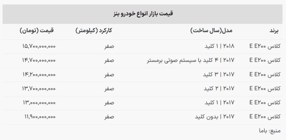 بر اساس این گزارش، قیمت بنز E۲۰۰ مدل یک کلید صفر مدل ۲۰۱۸ به ۱۵ میلیارد و ۷۰۰ میلیون تومان رسید.