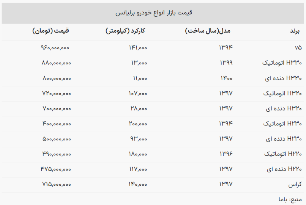 اقتصاد آنلاین/ در این گزارش قیمت روز خودروهای برلیانس در بازار را مورد بررسی قرار می دهیم.