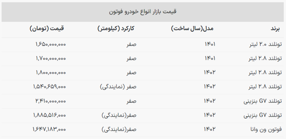 قیمت فوتون تونلند ۲.۰ لیتر مدل ۱۴۰۱ صفر ۱ میلیارد و ۶۵۰ میلیون تومان شد.