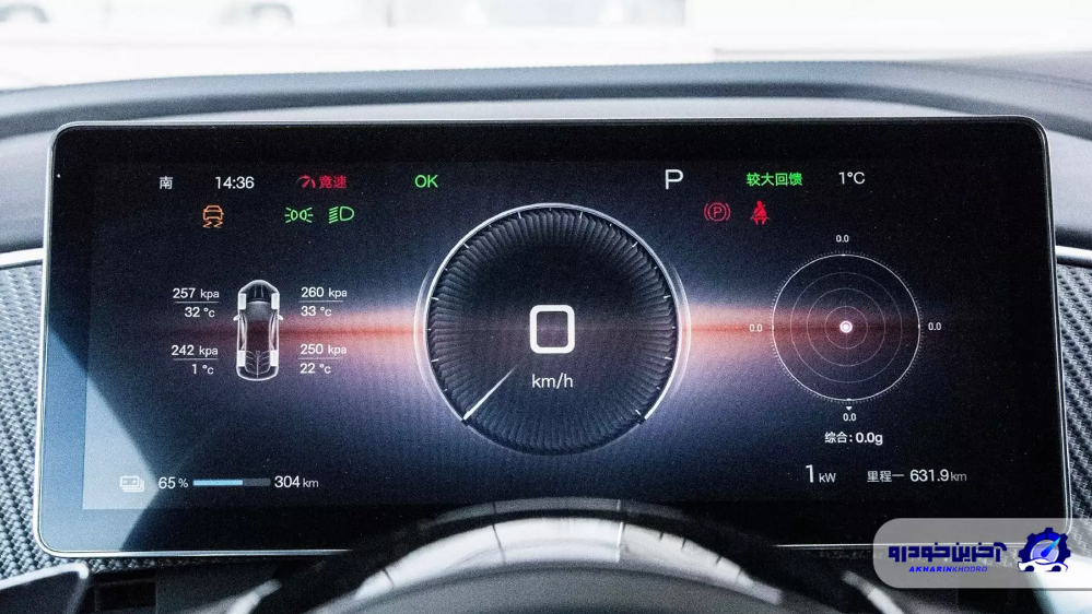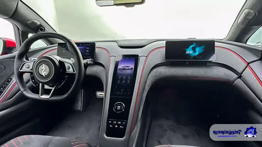 در داخل کابین با فضایی متفاوت روبرو هستیم. راننده و سرنشین کناری بی وای دی یانگ وانگ U9 سه نمایشگر دیجیتال را پیش روی خود دارند. نکته منفی اینکه حاشیه این نمایشگرها خیلی زیاد است و حس قدیمی بودن در بیننده ایجاد می شود. نمایشگرهای موجود در مقابل صندلی راننده و سرنشین کناری ۱۰.۲۵ اینچی هستند، اما نمایشگر کشیده حاضر در قسمت میانی، اندازه ای برابر با ۱۲.۳ اینچ دارد. فرمان U9 خیلی بزرگ طراحی شده و برای دسترسی آسان تر به امکانات خودرو، دکمه هایی روی آن تعبیه شده است.