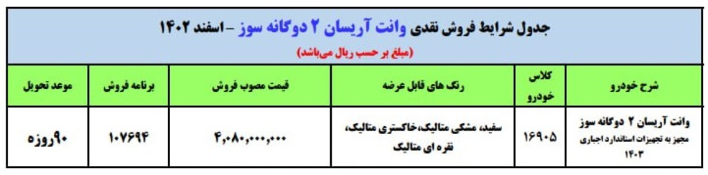 اطلاعیه فروش فوق العاده وانت آریسان2 دوگانه سوز