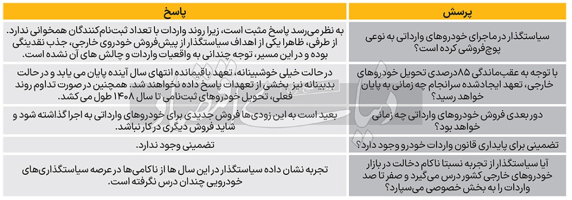در نهایت اینکه آیا سیاستگذار از تجربه نسبتا ناکام دخالت در بازار خودروهای خارجی کشور درس میگیرد و صفر تا صد واردات را به بخش خصوصی میسپارد یا همان روش فعلی را ادامه خواهد داد؟