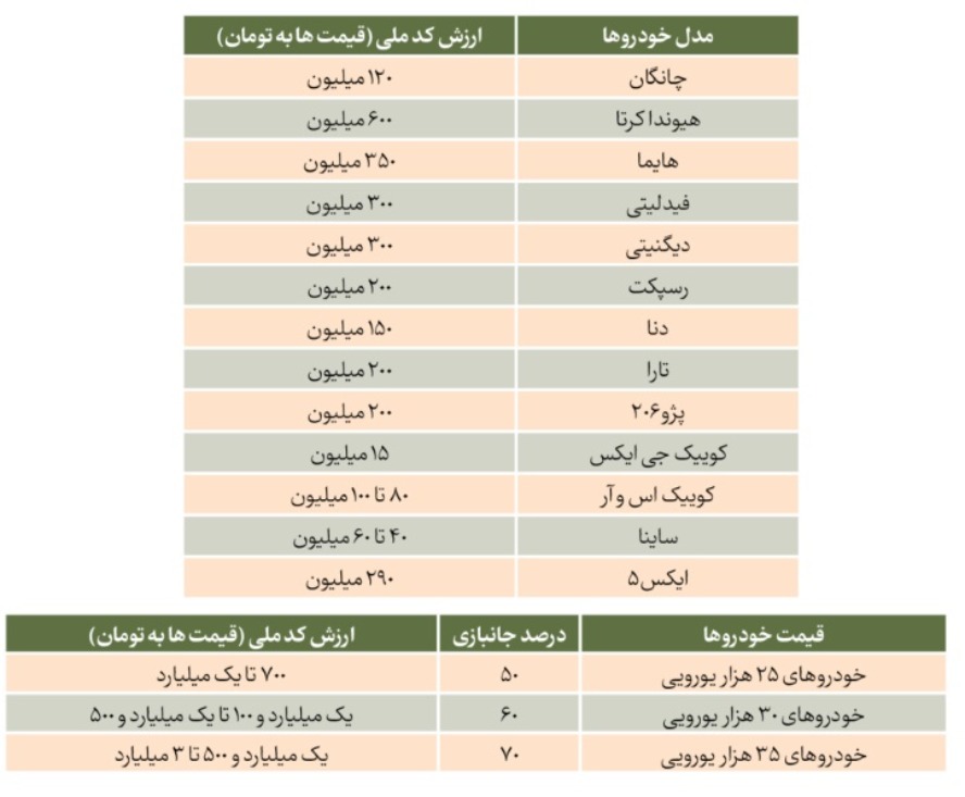 در جداول داخل گزارش به بخشی از سودهای خالصی که به واسطه و یا صاحب کد ملی میرسد، اشاره شده است. در بین خودروهای مدیران خودرو ارزش کد ملی (برای ثبتنامکنندگان در سامانه یکپارچه) بین 50 میلیون تومان تا 100 میلیون تومان است. برای خودروهای کرمان موتور این عدد از 100 میلیون تومان تا 290 میلیون تومان است. حواله محصولات ایران خودرو نیز از 150 میلیون تومان تا 350 میلیون تومان است. برای خودروی هایما ارزش حواله، 350 میلیون تومان، دنا حدود 150 میلیون تومان و پژو 206 نیز 200 میلیون تومان است. حواله محصولات سایپا نیز از 15 میلیون تومان تا 100 میلیون تومان است. به عنوان مثال در خودروی کوییک جی ایکس، عدد یاد شده در حدود 15 میلیون تومان و کوییک اس و کوییک آر از 80 میلیون تومان تا 100 میلیون تومان است. حواله شاهین نیز این روزها 100 میلیون تومان خرید و فروش می شود. همچنین در محصولات گروه بهمن حواله رسپکت 200 میلیون تومان، فیدلیتی و دیگنیتی هم 300 میلیون تومان است. خودروهای وارداتی در صدر این لیست ها هستند؛ حواله (تکمیل وجه شده در سامانه یکپارچه خودرو) هیوندای کرتا و تویوتا کرولا بین 400 میلیون تومان تا 650 میلیون تومان است.
