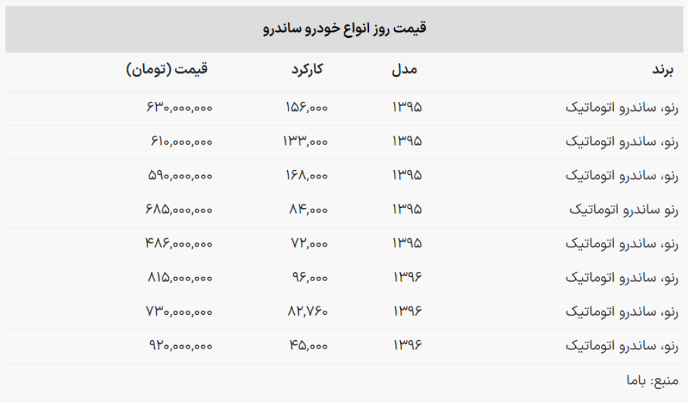 با مطالعه جدول زیر اطلاعات کاملی درباره قیمت روز خودروهای ساندرو به دست خواهید آورد:
