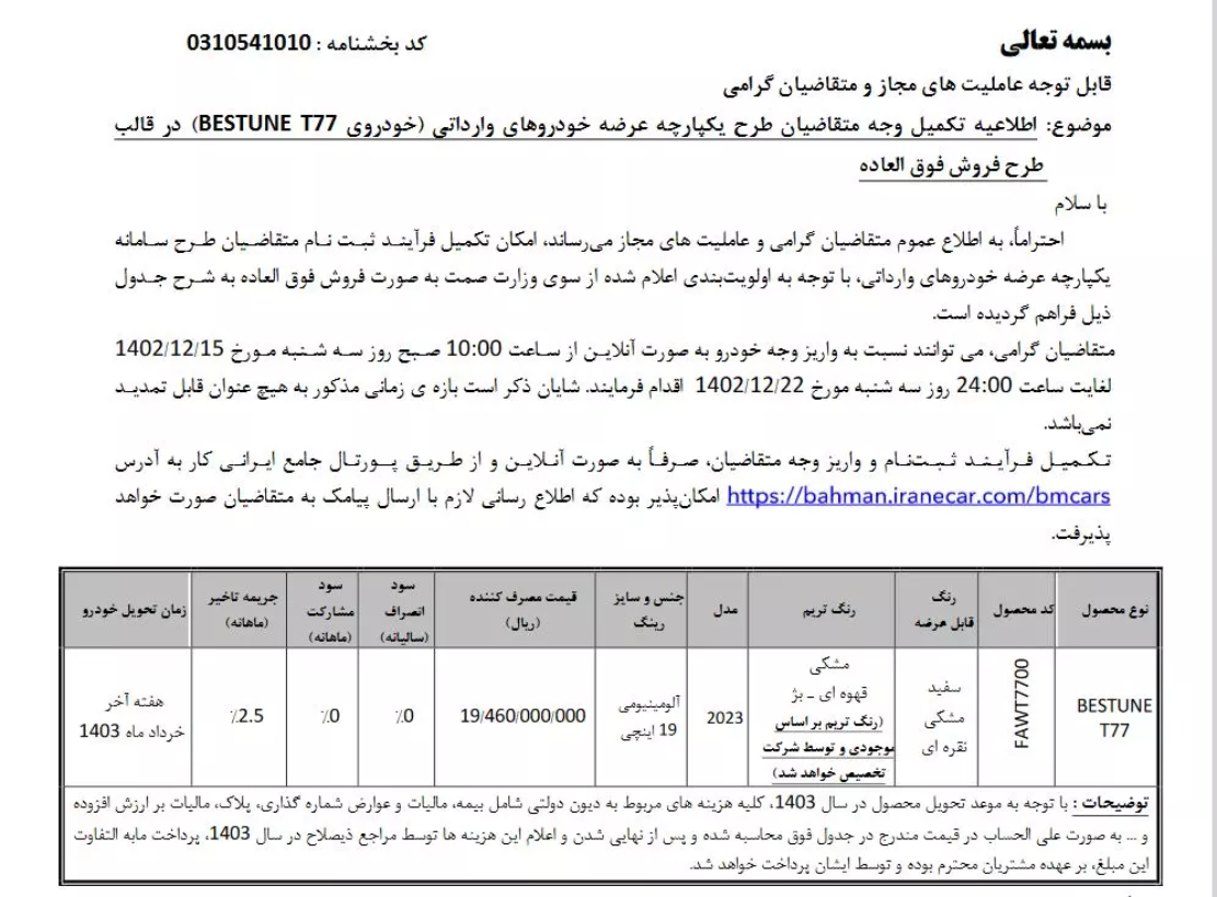 تکمیل فرآیند ثبت نام و واریز وجه متقاضیان، صرفا به صورت آنلاین و از طریق پرتال جامع ایرانی به آدرس www.bahman.iranecar.com/bmcars امکان پذیر بوده که اطلاع رسانی لازم با ارسال پیامک به متقاضیان صورت خواهد پذیرفت.