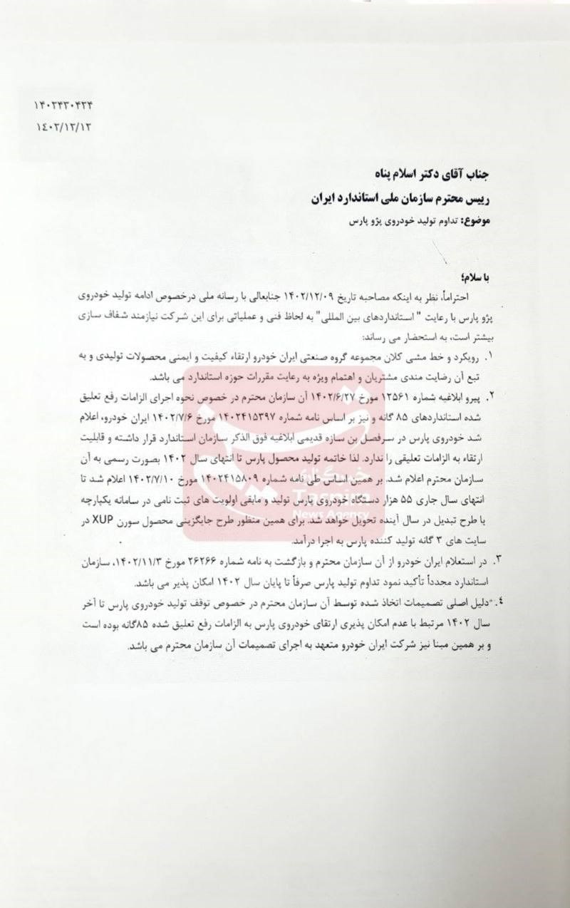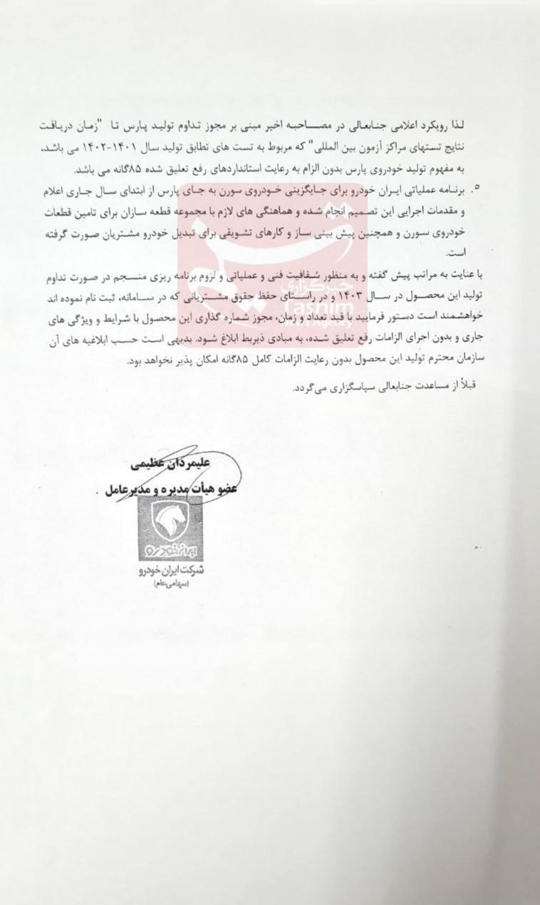 در نامه مدیرعامل ایرانخودرو به سازمان استاندارد ارائه مجوز شفاف درباره امکان تداوم تولید پارس با استانداردهای فعلی عنوان شده، چرا که پارس استانداردهای 85 گانه را اخذ نمیکند.
