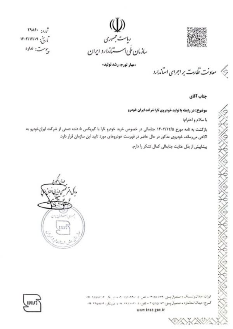 این در حالی است که مهدی انگورج مدیرکل دفتر تخصصی ارزیابی انطباق صنایع حمل و نقل و ماشین آلات سازمان ملی استاندارد اعلام کرده خودرو تارا با گیربکس 5 دنده دستی در فهرست خودروهای مورد تایید سازمان استاندارد قرار دارد.