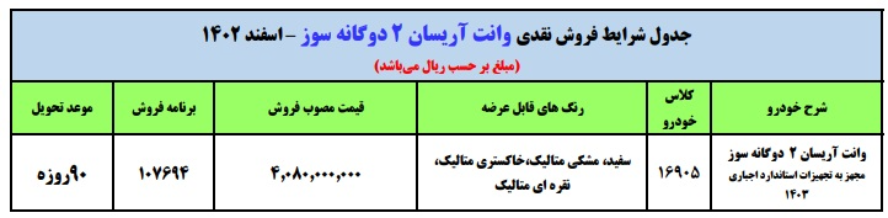 ایران جیب/ به اطلاع عموم متقاضیان محترم و نمایندگیهای مجاز میرساند، شرکت ایران خودرو در راستای ایجاد امکان ثبت نام در نمایندگی و عرضه خودرو به مصرف کنندگان واقعی طرح فروش نقدی خودروی وانت آریسان 2 دوگانه سوز، مجهز به تجهیزات استاندارد اجباری 1403 با موعد تحویل حداکثر 90 روزه را با شرایط جدول ذیل ارائه می نماید: