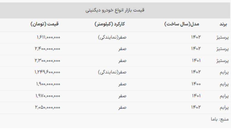 با مطالعه جدول زیر اطلاعات بیشتری درباره قیمت روز خودروهای دیگنیتی به دست خواهید آورد: