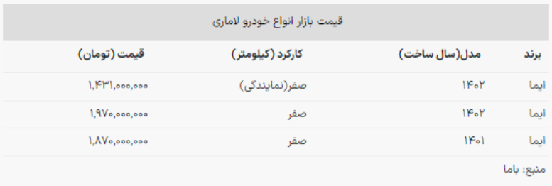قیمت مدل ۱۴۰۱ لاماری ایما نیز در بازار ۱ میلیارد و ۸۷۰ میلیون تومان شد که ۱۰۰ میلیون تومان گران شده است.