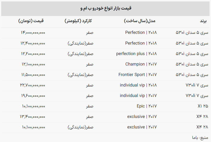 قیمت ب ام و سری ۵ در نمایندگی ۱۲ میلیارد و ۴۰۰ میلیون تومان تومان است. ب ام و ایکس چهار هم در نمایندگی ۱۰ میلیارد و ۱۰۰ میلیون تومان است.