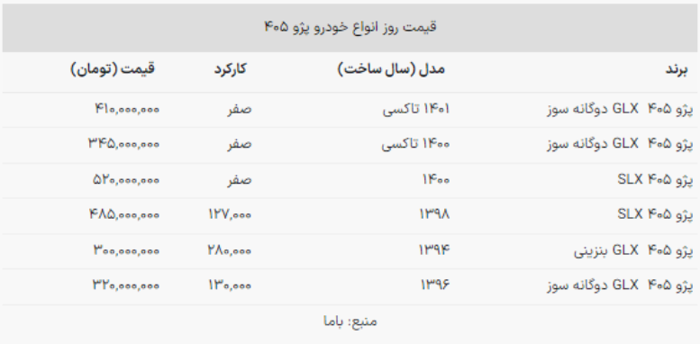 با مطالعه جدول زیر اطلاعات بیشتری درباره قیمت روز خودروهای پژو ۴۰۵ به دست خواهید آورد: