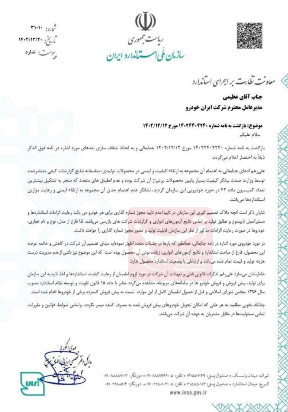در بندهای مختلف این نامه که به امضای انگورج، مدیرکل سازمان استاندارد رسیده، موضوعات مختلفی از جمله نتایج گزارشهای کیفی خودروها، الگوهای اقتصادی ایران خودرو، هزینه های تولید و... عنوان شده اما حتی به نام خودرو پارس نیز که مجوز تولید آن مورد سوال ایران خودرو بود اشاره نشده و همچنان مشتریان و ایران خودرو را بلاتکلیف رها کرده است.