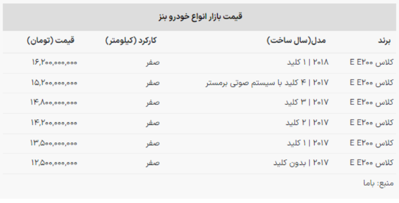 با مطالعه جدول زیر اطلاعات کاملی درباره قیمت روز انواع خودروهای بنز در بازار به دست خواهید آورد: