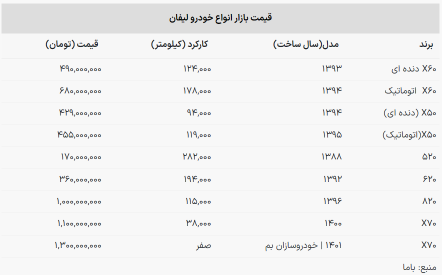 با مطالعه جدول زیر اطلاعات بیشتری درباره قیمت روز خودروهای لیفان به دست خواهید آورد:
