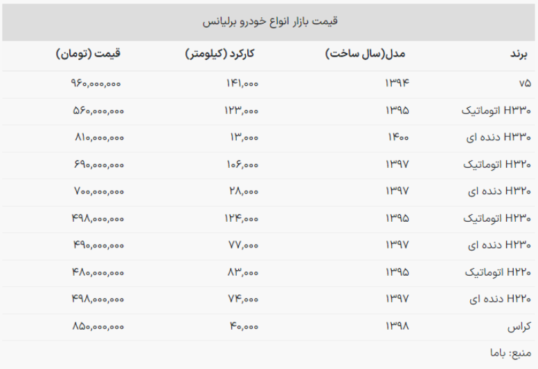 با مطالعه جدول زیر اطلاعات کاملی درباره قیمت روز انواع خودروی برلیانس به دست خواهید آورد: