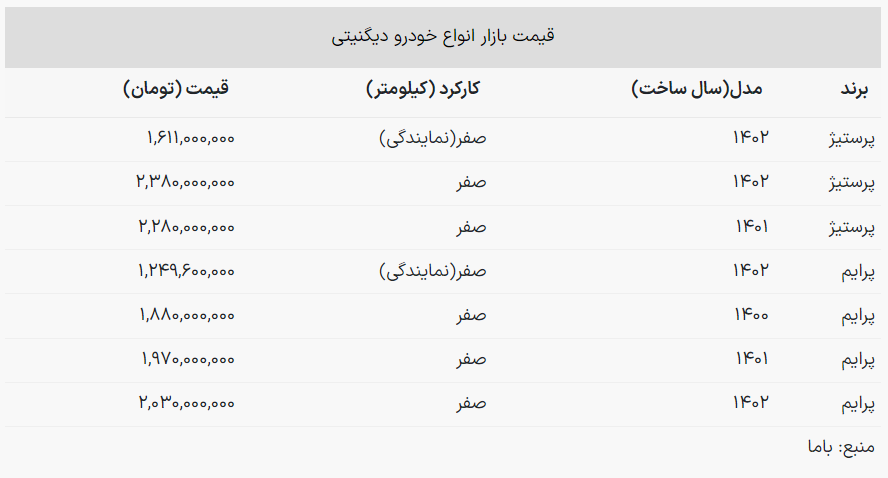 قیمت دیگنیتی صفر مدل پرستیژ ۱۴۰۲ با کاهش ۲۰ میلیونی ۲ میلیارد و ۳۸۰ میلیون تومان شد.