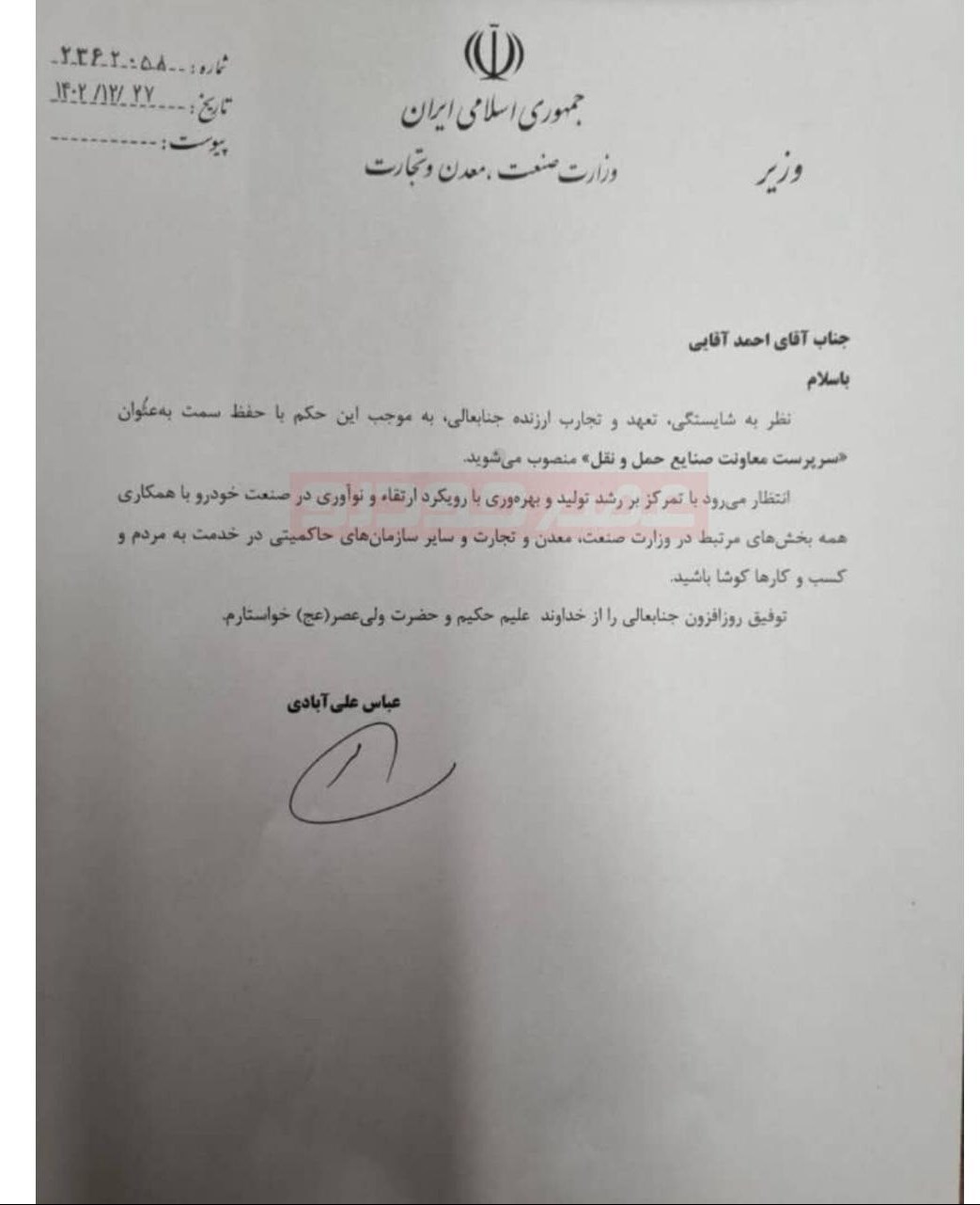 عصر خودرو/ احمد آقایی به عنوان سرپرست معاونت حمل و نقل وزارت صنعت، معدن و تجارت منصوب شد.