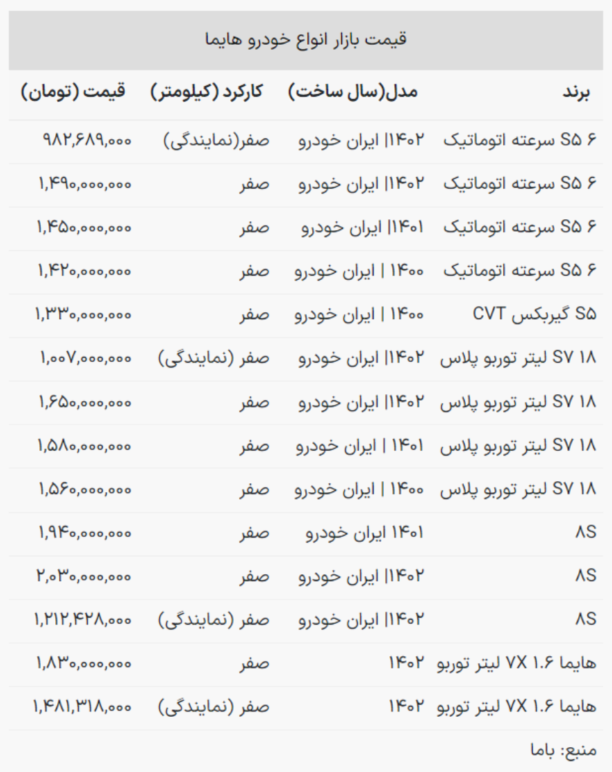 با مطالعه جدول زیر اطلاعات کاملی درباره قیمت روز خودروهای هایما به دست خواهید آورد: