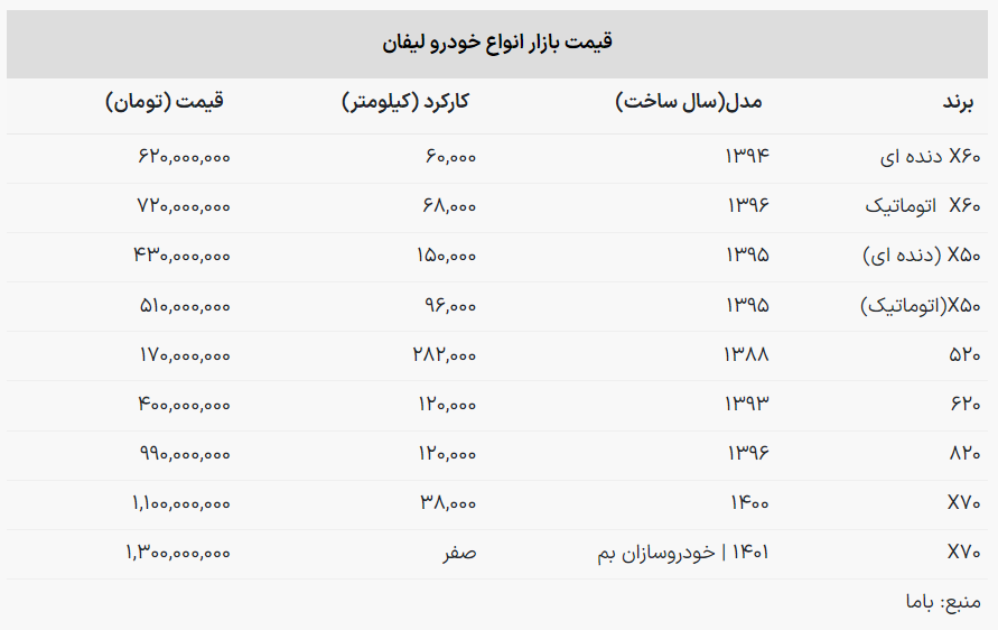 با مطالعه جدول زیر اطلاعات بیشتری درباره قیمت روز خودروهای لیفان به دست خواهید آورد:
