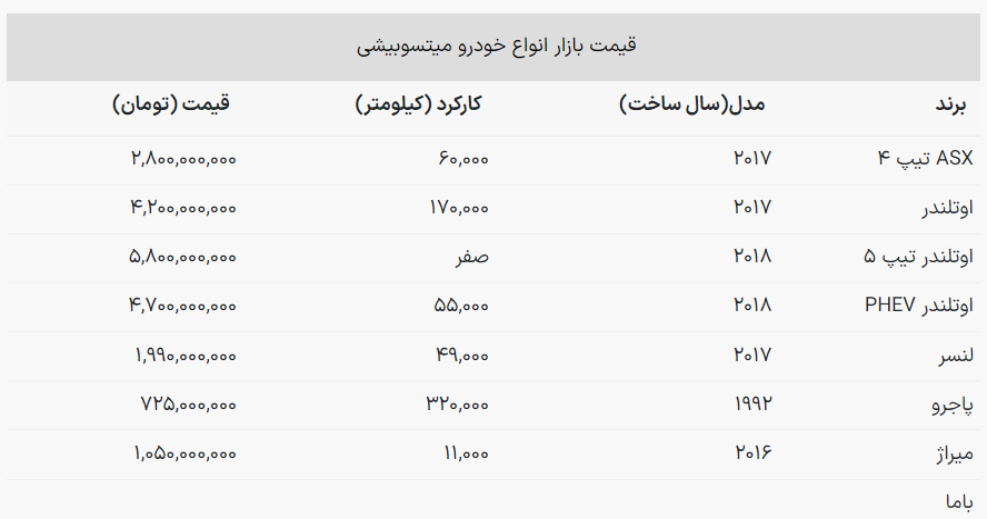 اقتصاد آنلاین/ در این گزارش به قیمت مدل های مختلف میتسوبیشی در بازار آزاد می پردازیم.
