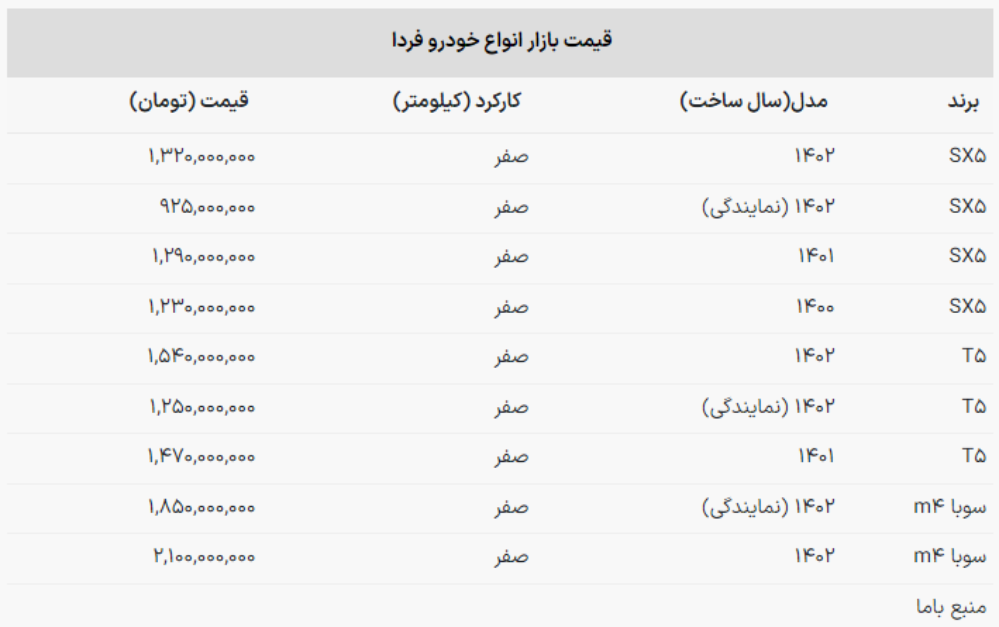 قیمت کارخانه ای فردا موتورز برای سوبا M۴ صفر مدل ۱۴۰۲ ۲ میلیارد و ۳۰۰ میلیون تومان اعلام شده است.