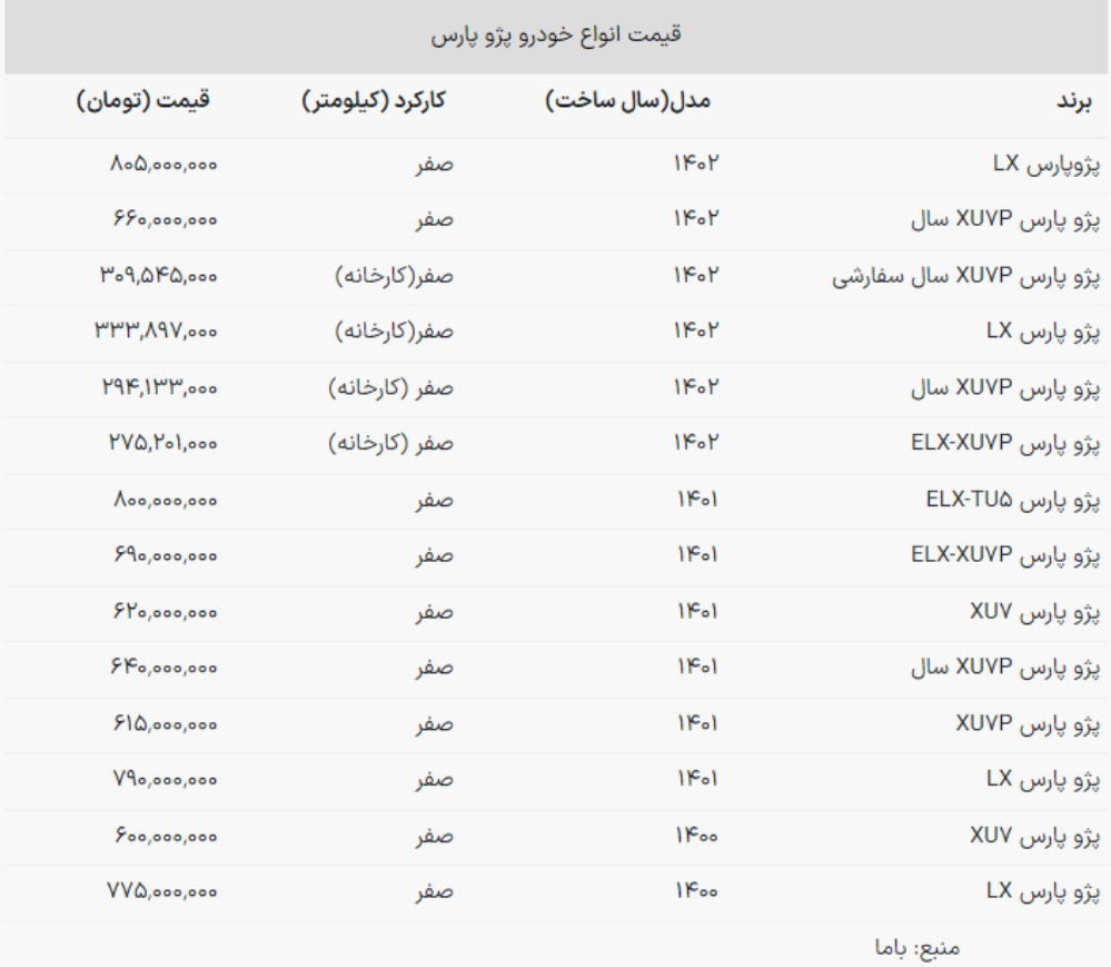 قیمت کارخانه خودروهای پژو پارس نیز از ۲۷۵ میلیون ۳۳۳ میلیون تومان متغیر است.