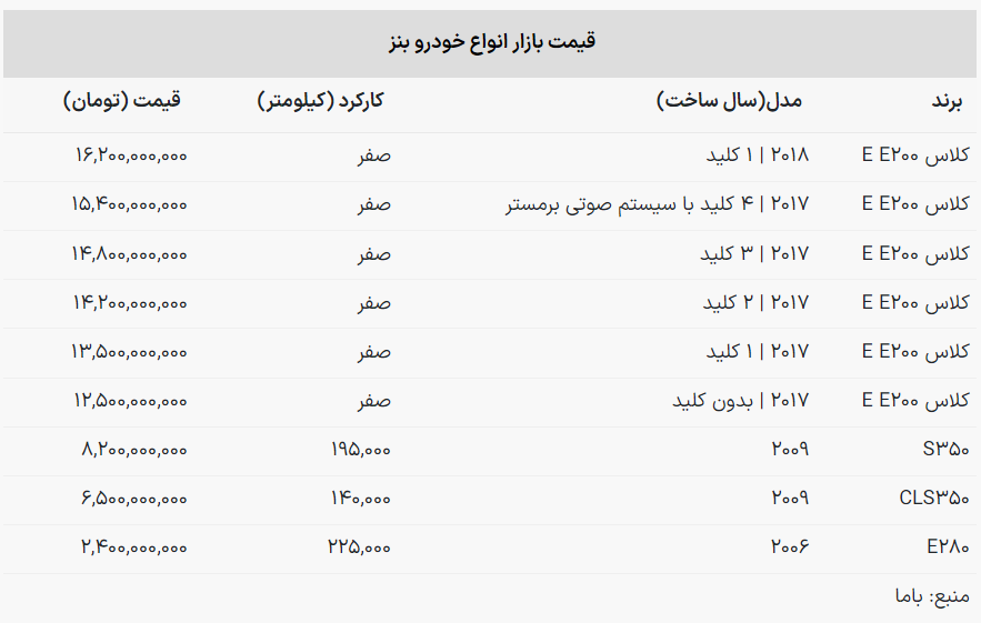 با مطالعه جدول زیر اطلاعات کاملی درباره قیمت روز انواع خودروهای بنز در بازار به دست خواهید آورد.