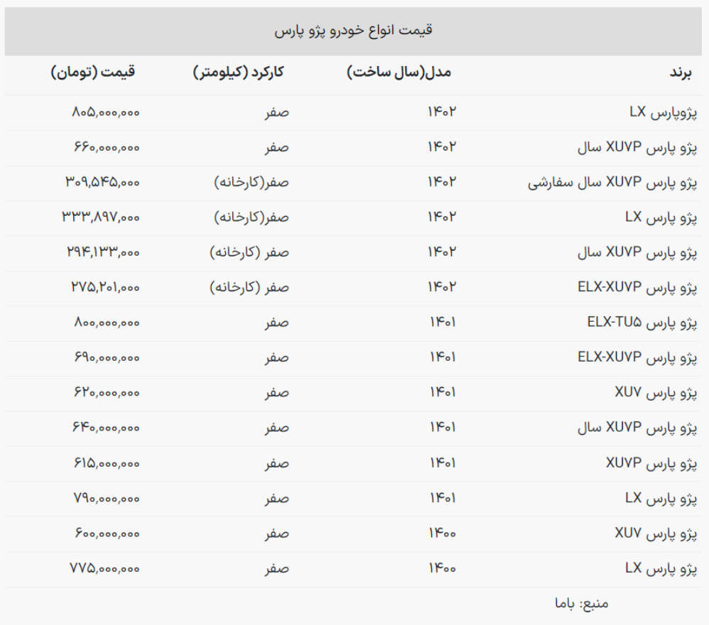 با مطالعه جدول زیر اطلاعات بیشتری درباره قیمت روز خودروهای پژو پارس به دست خواهید آورد: