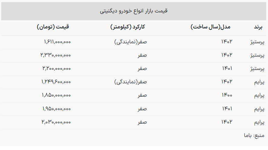قیمت دیگنیتی صفر مدل پرستیژ ۱۴۰۲ به ۲ میلیارد و ۳۰ میلیون تومان رسید.